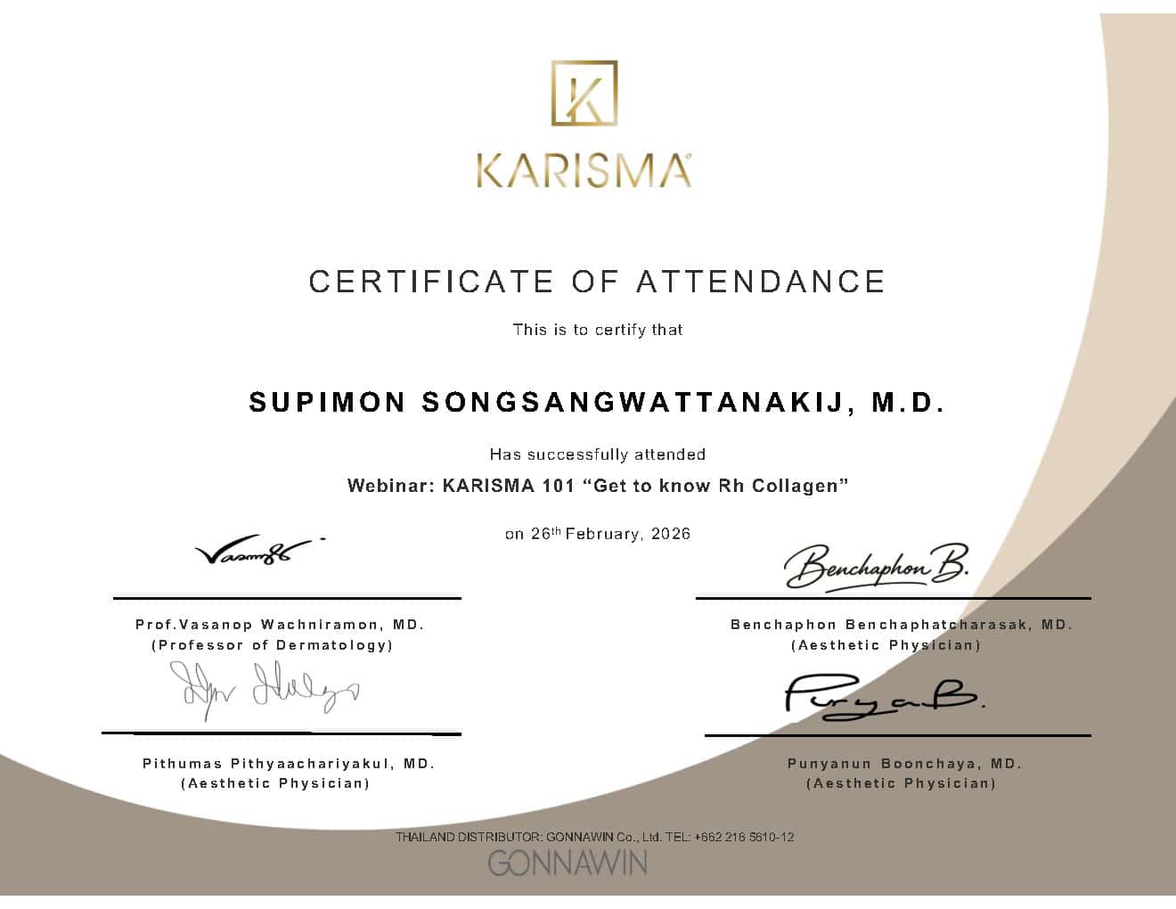 - Certificate of Attendance : NECK, LIPS, EAR, FOREHEAD REJUVENATION WITH JALOR FILLER AND KARISMA COLLAGEN