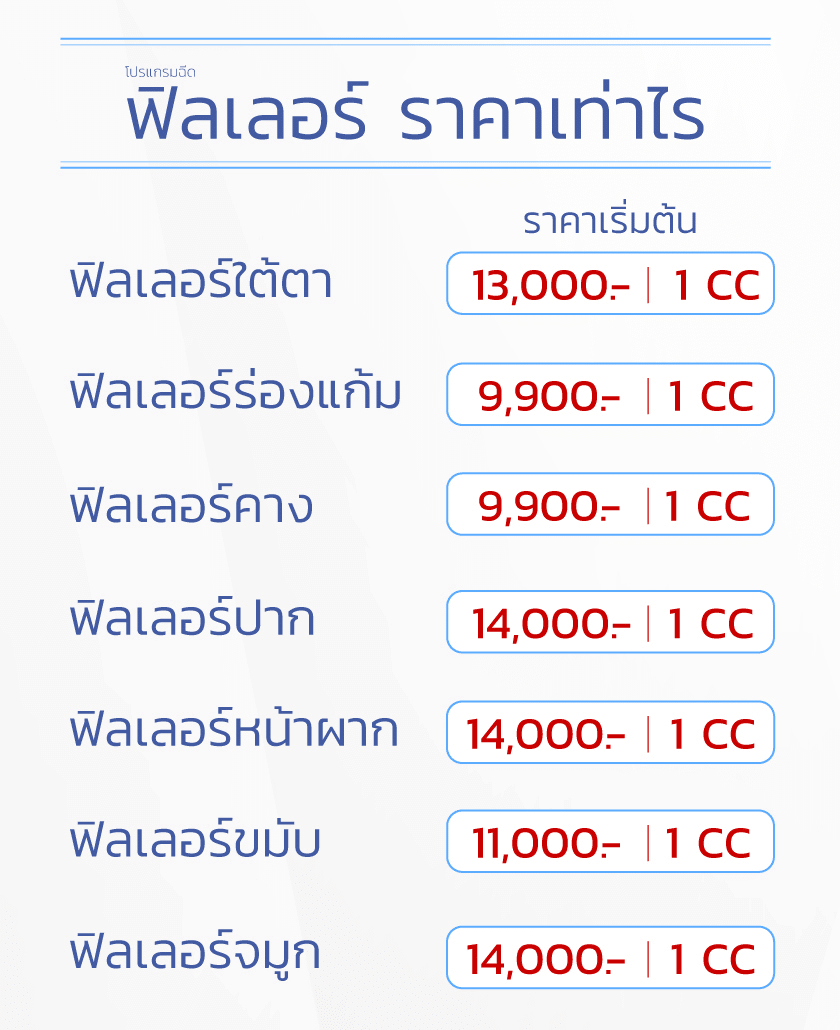 อ่านบทความเพิ่มเติม :ฟิลเลอร์ ราคา เท่าไหร่ ? โปรโมชั่นฟิลเลอร์แต่ละยี่ห้อ แต่ละจุดใช้กี่ CC ?