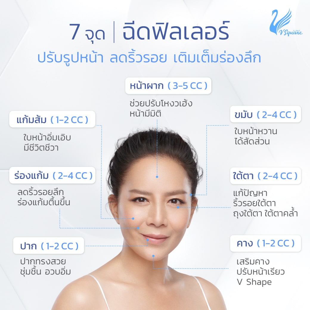 - ฉีดฟิลเลอร์กรอบหน้า ช่วยสร้างกรอบหน้าให้คมชัด หน้าวีเชฟ (V Shape) ใช้ประมาณ