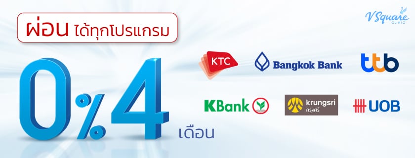 สมาชิกบัตรเครดิต สามารถผ่อนชำระ 0% นาน 4-6 เดือน วันนี้ – 31 ส.ค. 68 ได้ที่ V Square Clinic ทุกสาขา ตามเงื่อนไขที่กำหนด ดูเพิ่มเติมได้ที่โปรโมชั่น V Square Clinic