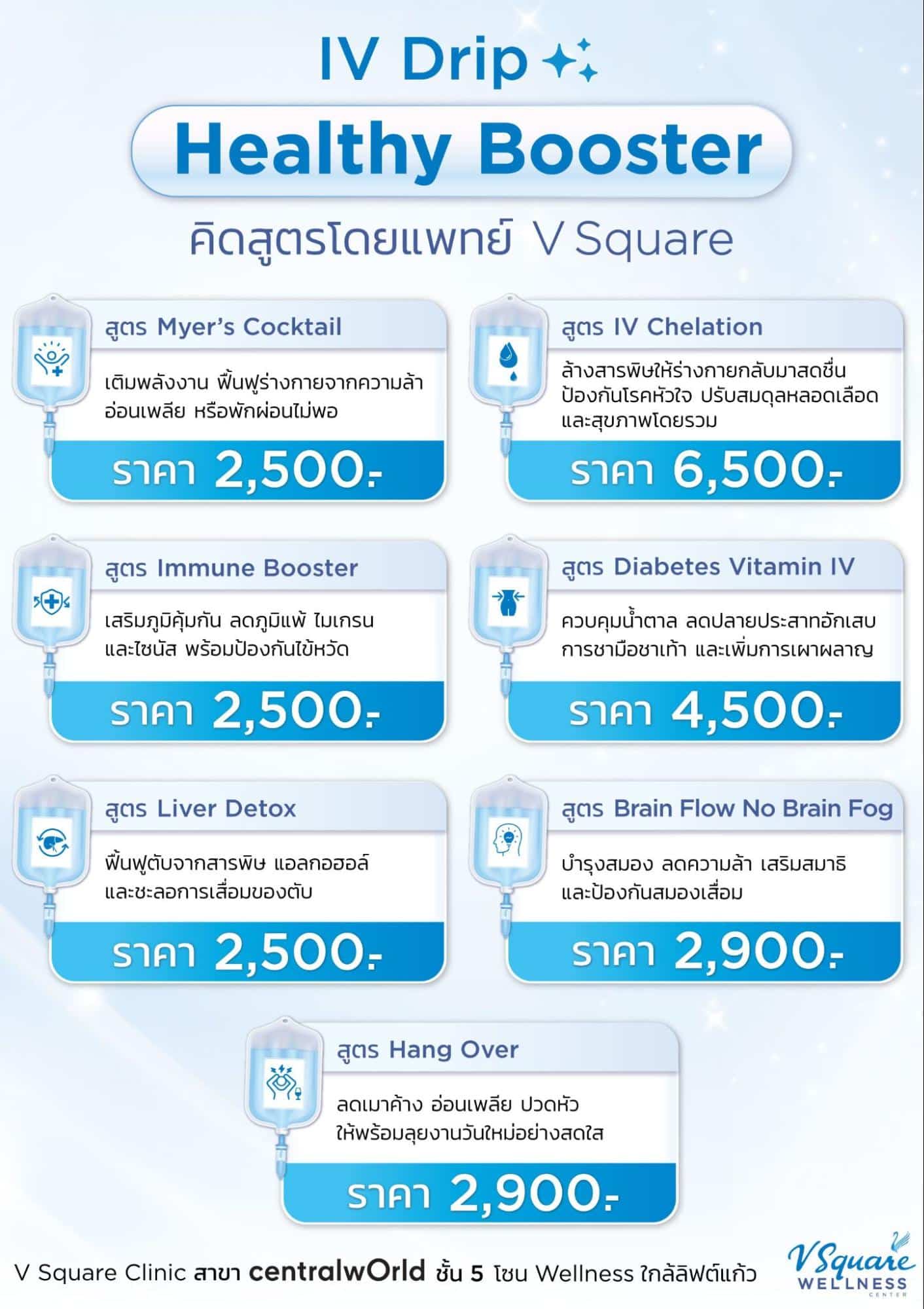 IV Drip ที่ V Square Wellness ให้คำปรึกษาโดยแพทย์ ฟรีไม่มีค่าใช้จ่าย มีวิตามินหลายสูตรให้เลือกครับ Myer’s V Booster จัดอยู่ในกลุ่ม V Healthy Booster ราคาเริ่มต้น 2,500.- และยังมีสูตร V Bright Booster สำหรับคนที่ต้องการเน้นงานผิวโดยเฉพาะ